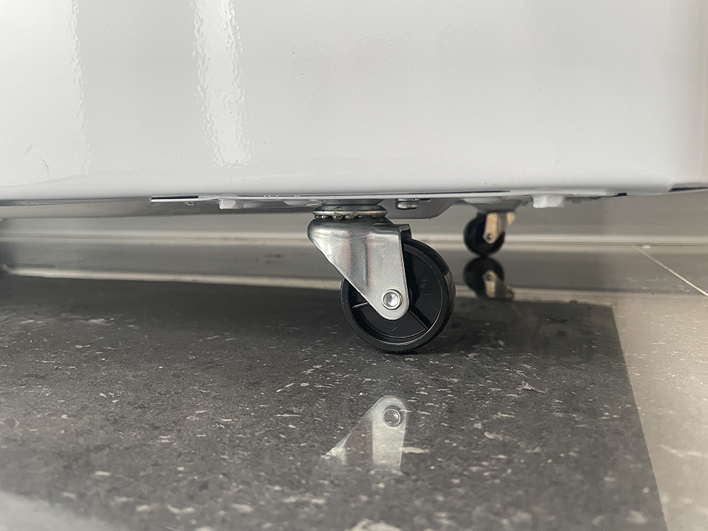 - 具活動式腳輪、電源指示、溫控旋鈕器。